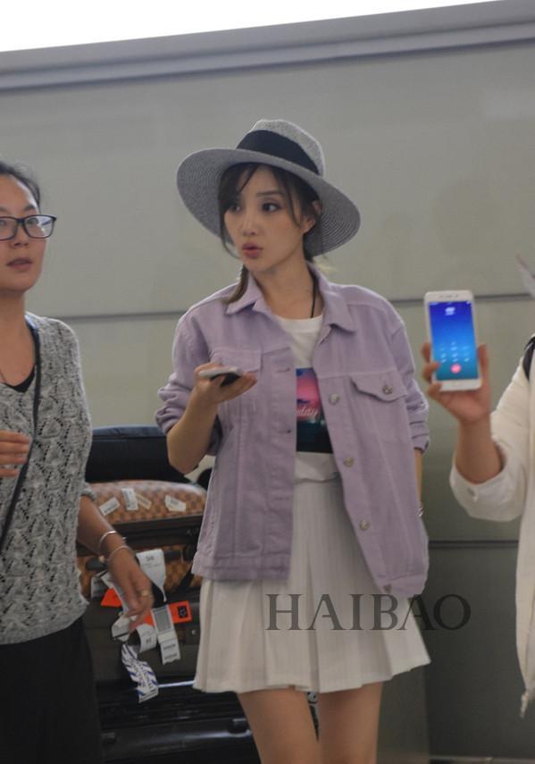 见惯了蓝色的牛仔服,李小璐这身紫色的还挺清爽,内搭白Tee与白色百褶裙也青春洋溢,小圆礼帽也为这身加分不少。