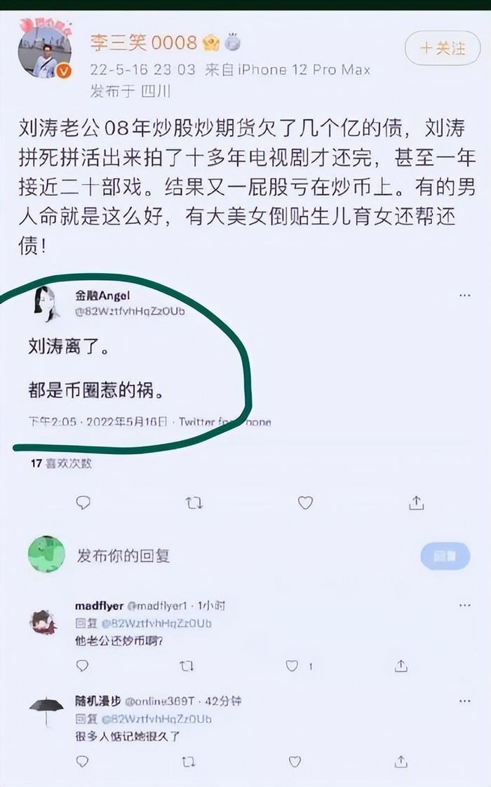 近日,有网友便发现王珂删除了所有微博动态,当然也包括之前表白刘涛秀恩爱的动态,账号也取关了刘涛。5月16日,有网友在社交平台上放出大瓜,曝光知名艺人刘涛和老公王珂发生婚变,相关网友爆料说刘涛与丈夫王珂离婚原因是王珂玩货币亏了几个亿。