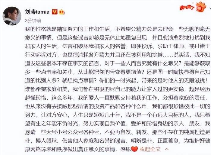 但很快,5月17日,刘涛工作室便出来发文辟谣说此言非真,刘涛的文章言辞之间都是在维护自己的丈夫,并希望广大网友不信谣不传谣。