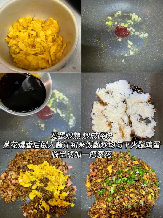 2、起锅倒油,将鸡蛋炒熟,再炒成碎块,备用…再将葱花爆香后,倒入调制好的灵魂酱汁,再倒入米饭,和米饭翻炒均匀,再下火腿鸡蛋,临出锅加一把葱花!