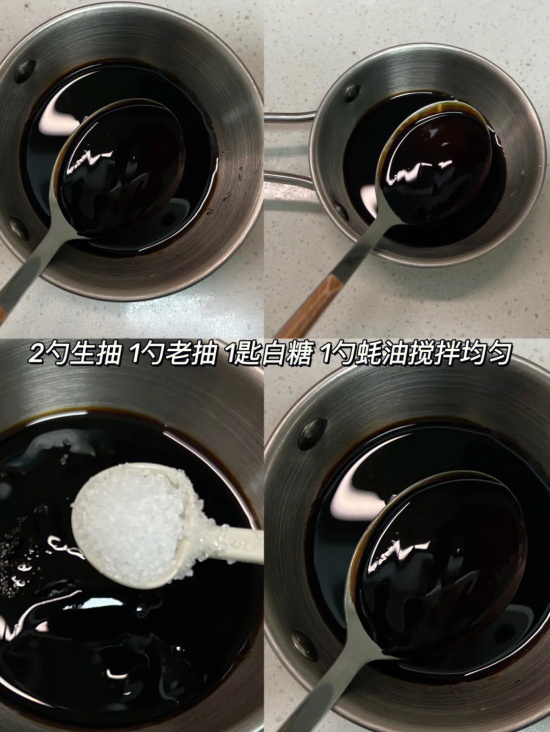 1、首先调个灵魂料汁:2勺生抽、1勺老抽、1匙白糖、1勺蚝油搅拌均匀,放着备用