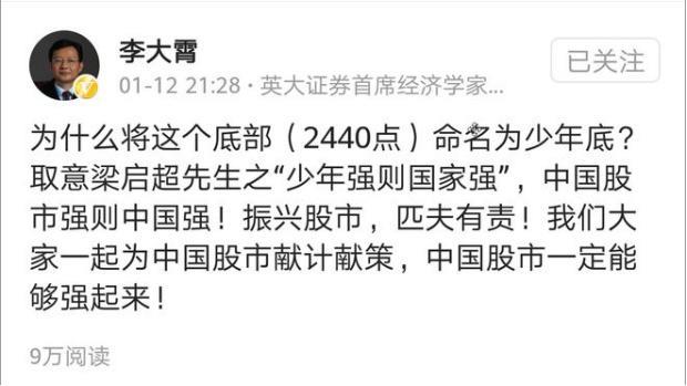 经历了18年的重挫,人们对于2019年的行情也充满了悲观情绪。然而,在市场从2440点刚刚反弹之时,李大霄就将2440点命名为少年底,还取了梁启超先生“少年强则国家强”的寓意。