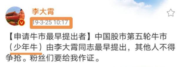 这一轮牛市,李大霄不仅要争当最早提出牛市的人,还要争当最坚定坚持牛市论断的人。这轮行情并非单边上攻的走势,其间阶段性的调整层出不穷。而每次调整,他都会用崭新的名词,来为投资者加油打气。比如2019年5月,大盘调整到2838点,其喊出少年底2,8月18日,沪指跌至2733点之时,又提出青春底的观点。直至年底,他又喊出大国牛已经到来。