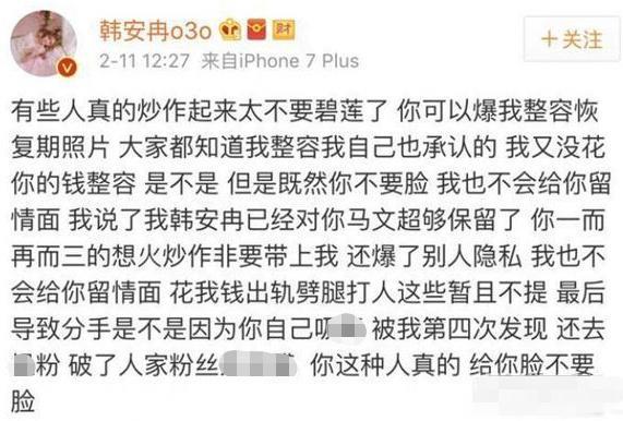 为了维持自己的形象,韩安冉立马发文反击,除了否认爆料之外,甚至还主动爆料马文超是小白脸,吃软饭,甚至还有“家暴”倾向。