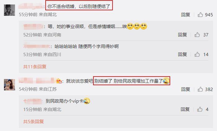 但韩安冉则不同,翻看她的评论区,大部分声音是让她别再结婚了,甚至还有人吐槽她别再给民政局增加工作量了。