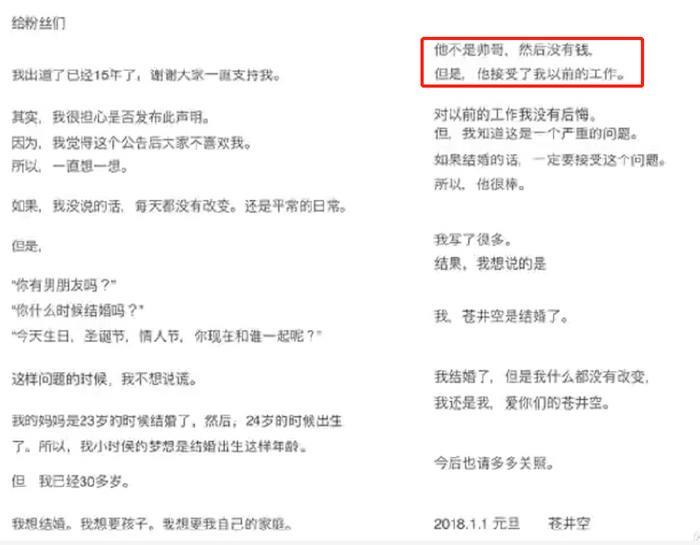 从字里行间不难看出,苍井空十分渴望拥有一个和睦幸福的家庭,而丈夫的出现无疑让她实现了这个简单的愿望。从她怀孕时晒出的照片来看,丈夫的确相貌平平与之不太相配,但是站在一旁搂着孕肚的她却是满脸幸福。