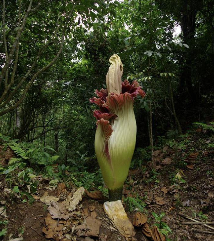 巨魔芋,又被人们称为“尸香魔芋”,名字的由来非常形象,因为它开花时,味道非常不香,反而腥臭难闻,犹如人类遗骸高度腐败后的味道,令人作呕。