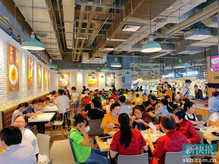 当天,备受期待的餐厅也正式揭开了神秘面纱。餐厅位于店内生鲜区一角,面积达713平方米,共有200个座位。餐厅呈开放式结构,暖色调的灯光,用餐环境显得明快又温馨。据悉,餐厅全部采用自助扫码点餐,顾客还可以通过小程序提前下单,再去店内就餐。