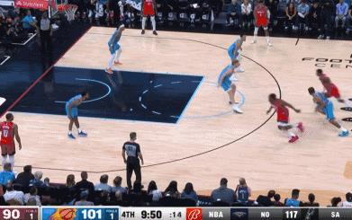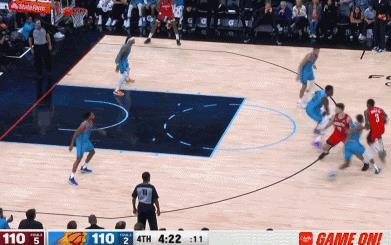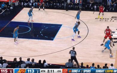 86-96落后10分进入末节,针对太阳祭出的兰代尔、韦恩莱特、达米安-李、沙梅特和佩恩阵容,塞拉斯派上费尔南多、马丁、伊森、戈登和波特应对,目的,发挥球队运动天赋,针对太阳的内线,效果如下: