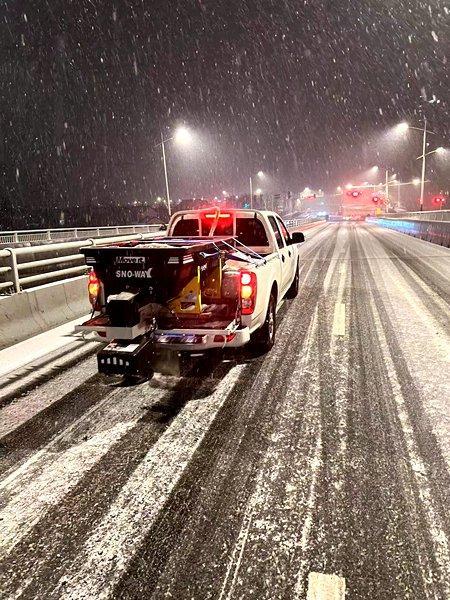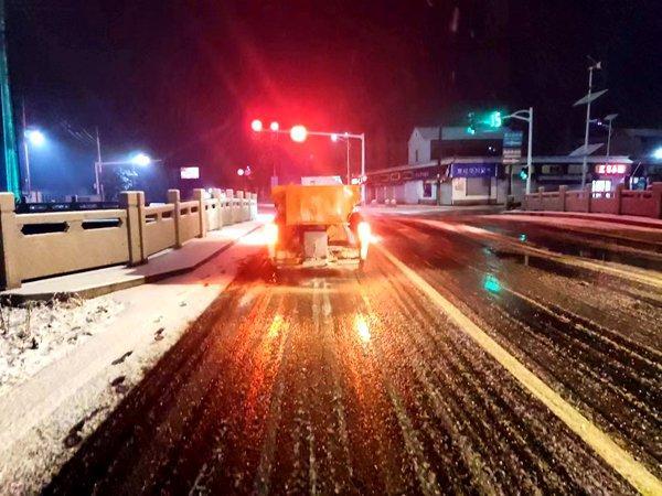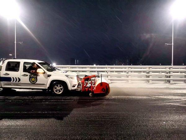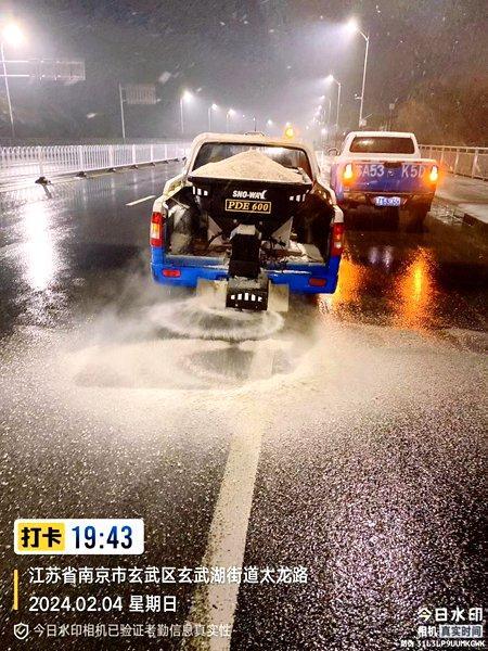 江宁区城管部门组织人员及机械对全域桥梁、高架、主干道非机动车道等区域机撒融雪剂,谨防路面结冰;同时,强化路面巡查,提高应急处置反应速度。