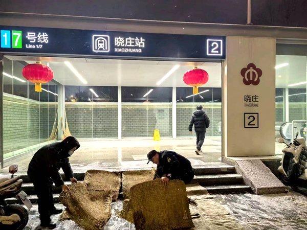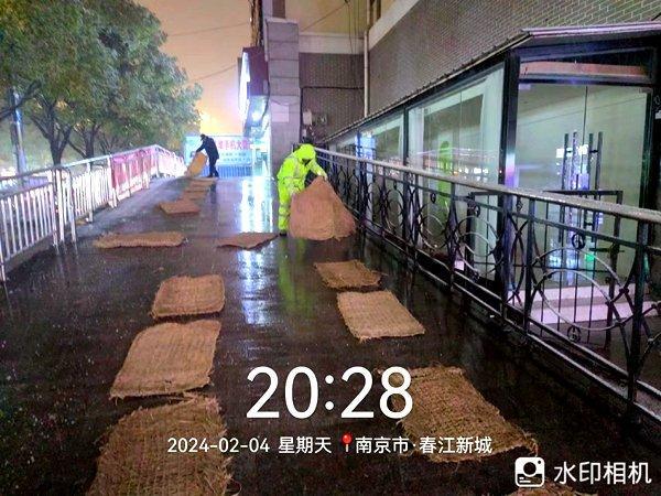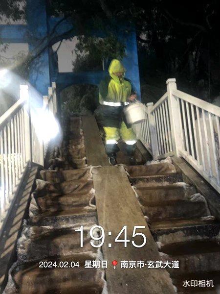 玄武区城管部门在人行天桥、跨线桥撒融雪剂,公厕铺设防滑草垫,保障行人通行安全。
