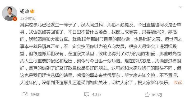 杨迪原文:其实这事儿已经发生一阵子了,没人问过我,我也不必提及。今日直播被问及是否单身,我也就如实回答了。平日里不管什么场合,我都力求真实,只要能说的,能播的,我都愿意和大家分享。就像19年那时节目里的那些话,也是肺腑之言。