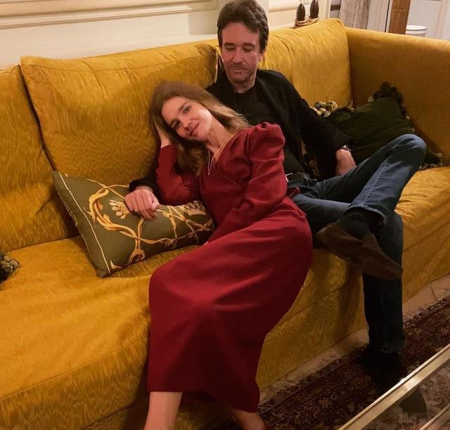 这是纳塔利·沃佳诺娃和阿尔诺在一起的样子,从画面中来看纳塔利·沃佳诺娃穿了一款红色的裙子躺在老公身边真的是太美了。