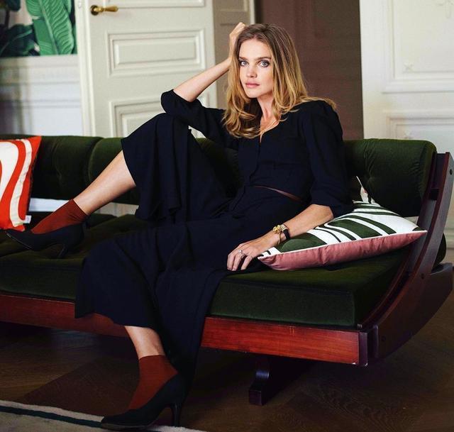 这是纳塔利·沃佳诺娃坐在一个绿色沙发上的样子,从画面中来看纳塔利·沃佳诺娃的气质真的是太出众了。