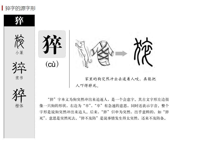 “猝”字最早出现于小篆时代,其古文字形左边非常像一只狗的形状,右边是“卒”,表示急速的意思,同时还表示字音。简体字版的“猝”字的楷书形式是从秦朝小篆时代逐渐演变而来的。