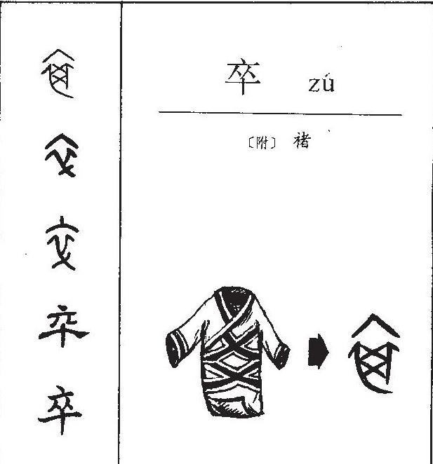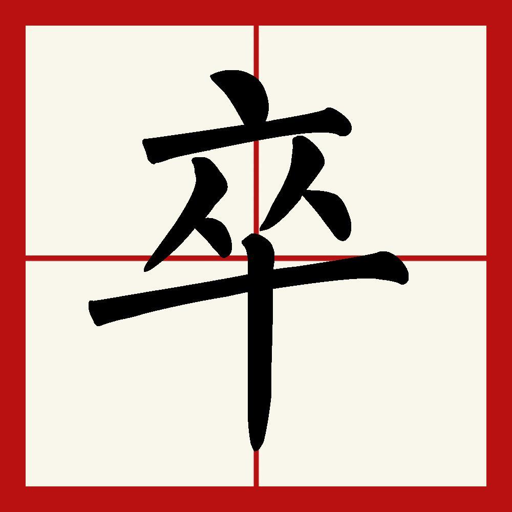 卒这个字有两个读音分别是(zú)和(cù),汉字中的“卒”原义指完成、终结,后引申为死亡。古时多指步兵。初见于商代甲骨文,其古字形一般认为像缝好了线的衣服。后来,“卒”也被用作隶役的代称,特指服役的士兵。此外,“卒”还有副词的用法,表示最终、终于等意义。有一种说法认为,“卒”的古字形是一个有特殊标记的衣服,原义是差役。以上这些意义均读作“zú”。