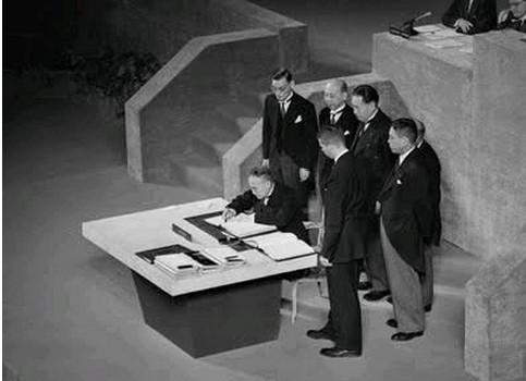 至于其他离岛则由盟国认定是否为日本所有。随着美苏冷战格局的日益明朗,美国对日本的态度由打压开始向扶植转变。1951年9月4日美国请了52个国家在旧金山同日本签订了和平条约,因此这一条约被称为《旧金山和约》,美国刻意将中、苏等国排除在外。值得注意的是:《旧金山和约》不仅排斥当时已然成立的新中国,台湾的中华民国政府也被排除在外。就这样美国在背着中国的情况下同日本达成和约。这份和约的第三条对日本除四大主岛之外的离岛做出了规定。