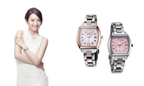 林依晨特别代言的两款广告款,都搭载了SEIKO(精工)太阳电能机芯。淡雅的玫瑰金表款,彰显职场女性干练而不失温柔的气质,低调奢华。不锈钢款的香槟粉色表盘映衬出独特造型的阿拉伯数字时标,仿佛沐浴在温暖柔和的色泽光辉下,体现出女性的率真美好及出众的品位。