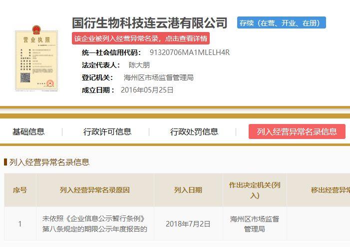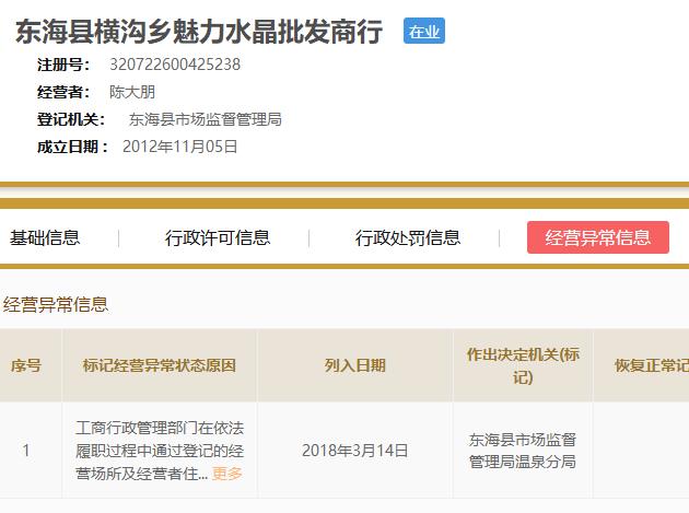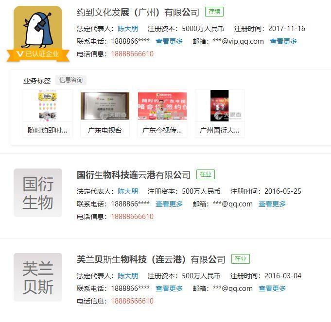 法人陈大朋名下除了“随时约”一家公司之外还有另外三家公司:国衍生物科技连云港有限公司、芙兰贝斯生物科技(连云港)有限公司以及东海县横沟乡魅力水晶批发商行。目前,有2家公司被当地工商局因为无法通过登记经营场所或者尚未报送年报而被列入异常经营名单。