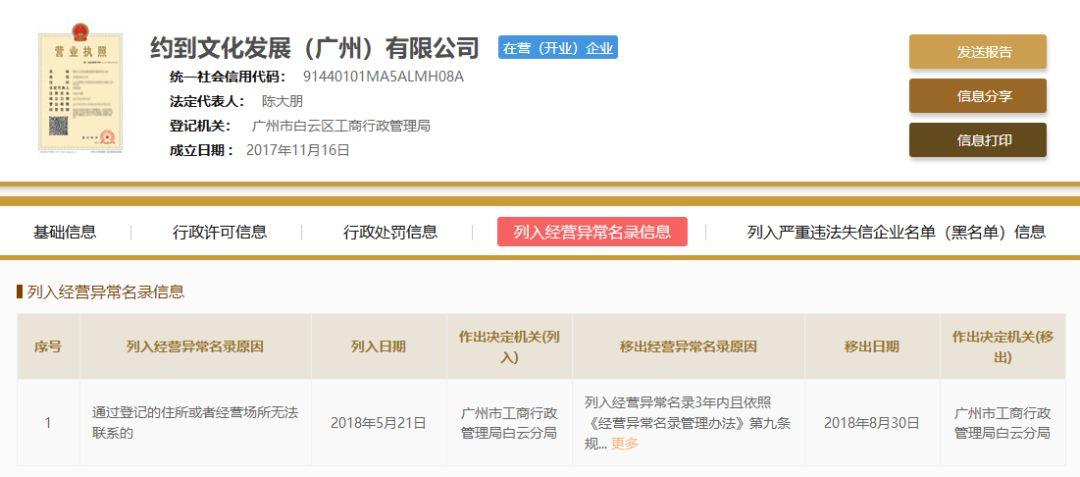 2018年5月份被广州市白云区工商局因为通过登记住所无法联系被列入异常经营范围。
