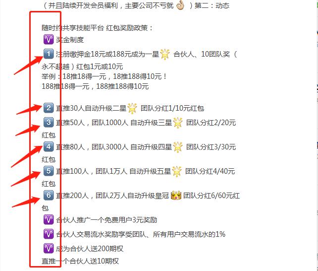 除了收取18元或者188元的会员费,随时约还设置了5个等级分明的动态推广拉人奖金制度。