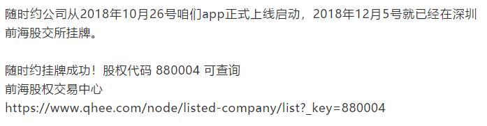 搞清楚期权股只是一个伪概念之后,我们再来核实一下“随时约”宣传资料里所说的“深圳前海股交所挂牌成功,股权代码是880004”是不是真的。