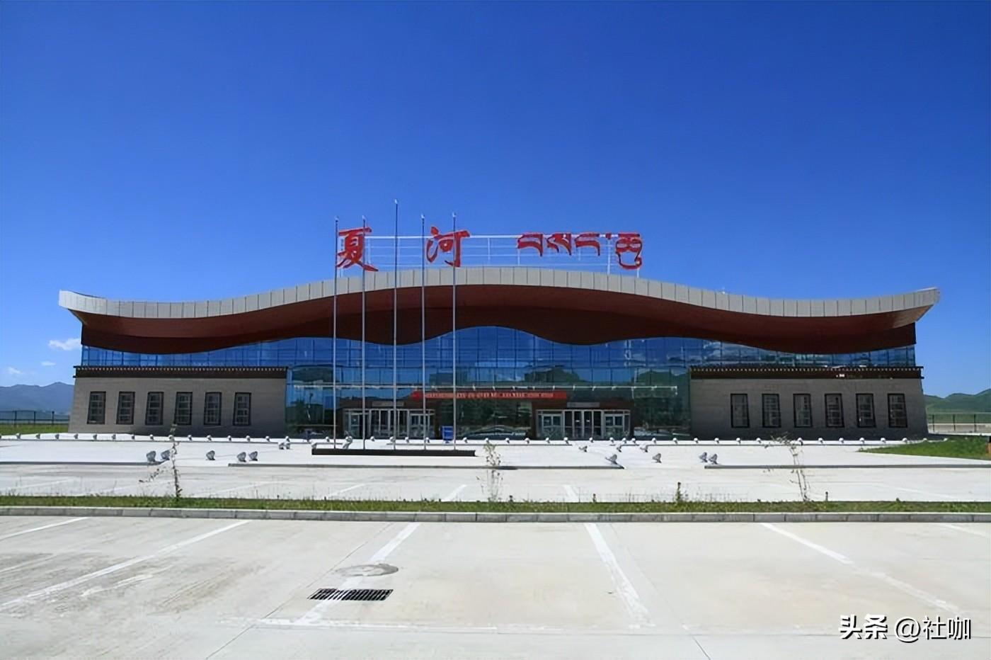 8.甘南夏河机场,位于中国甘肃省甘南藏族自治州夏河县库塞塘村,东北距合作市中心32千米,北距夏河县县城43千米,为4C级旅游支线机场,属高高原机场(3189.8米)。2023年8月1日,甘南夏河机场正式“复航”,开通后将执飞“成都——夏河”每日往返航班,从夏河机场出发经四川中转,可抵达北京、上海、广州、深圳、天津、西安、哈尔滨、拉萨等17个城市。甘南夏河机场航站楼面积3185平方米,站坪设3个C类机位,均为远机位;跑道长3200米,宽45米,可使用机型A319、B737-700及以下机型(高原型);可满足年旅客吞吐量14万人次、货邮吞吐量560吨的使用需求。