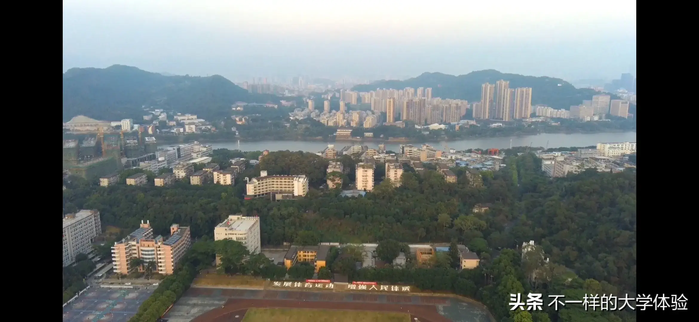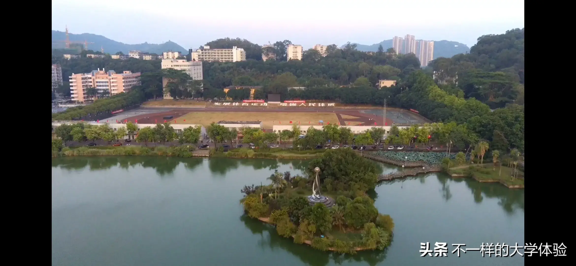 学校三面临江,三面环山,有山有水。校内以观音湖和瀑布闻名,试问哪个学校有瀑布?南北两座小山,试问哪个学校校园里同时有山有水有瀑布。
