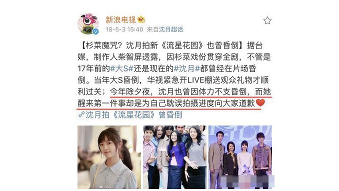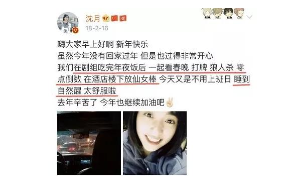 2018年2月,沈月发了条微博,畅谈和家人共度除夕的欢乐时光。可三个月后,在《流星花园》剧组的营销文案中,沈月的除夕是在剧组度过的,还因戏份太多累晕当场。