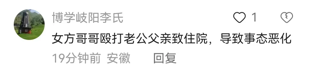 也有网友透露,据说是在闹离婚期间,女子的哥哥,把公公给打了,而且打住院了。
