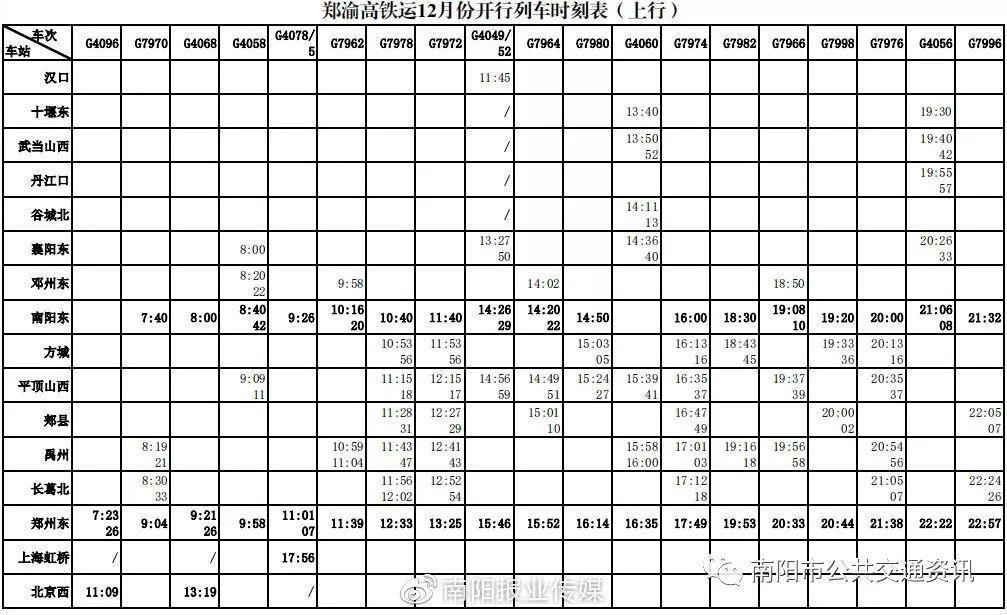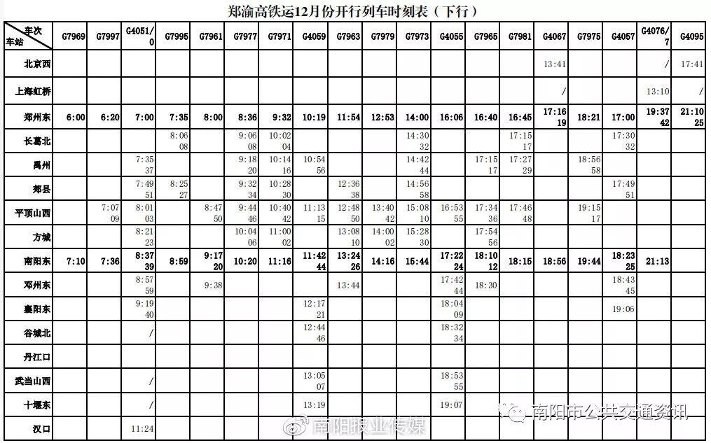 将有多趟列车停靠南阳东 、方城、邓州东,