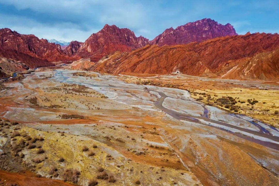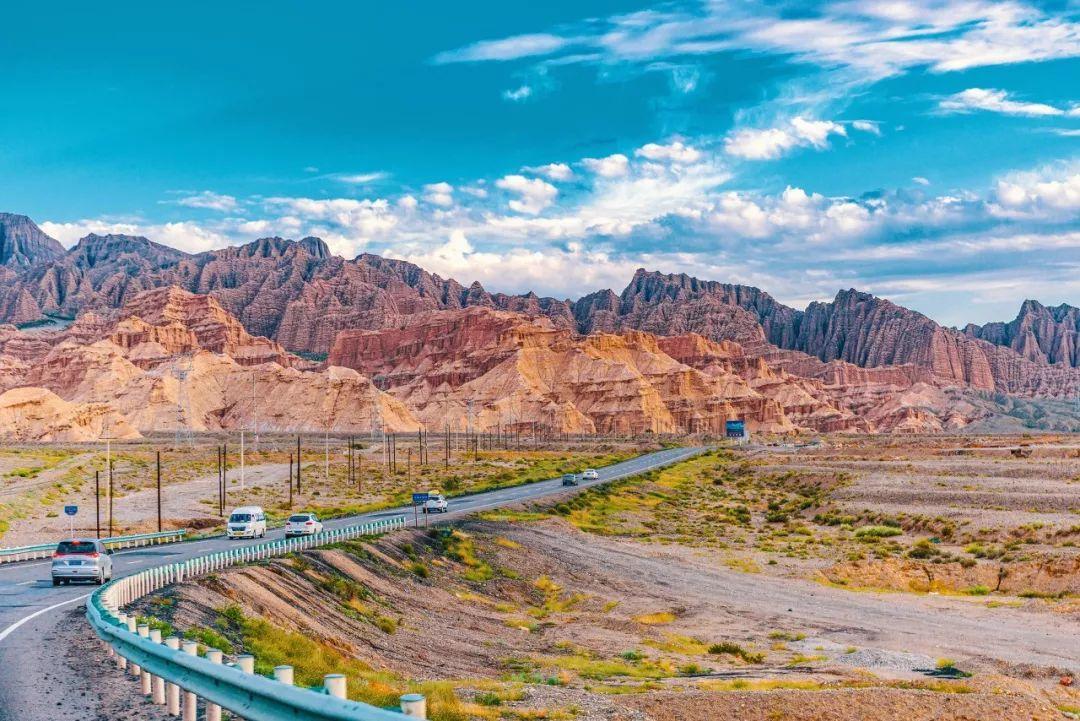 南疆的一段,你可以看到彩虹山和雅丹地貌,红色的山脉,是中原地区很难看到的景象。