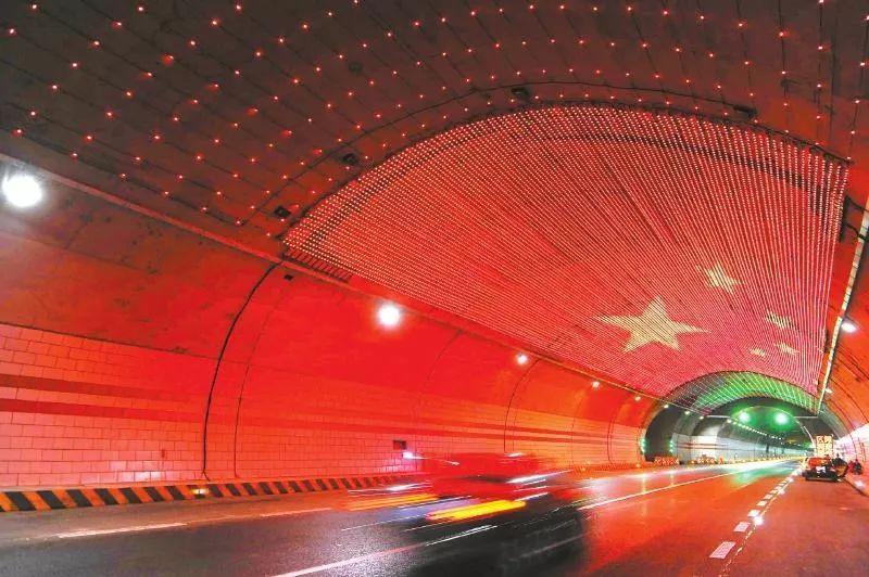 有用LED灯点组成的国旗图案的雅康高速二郎山隧道。