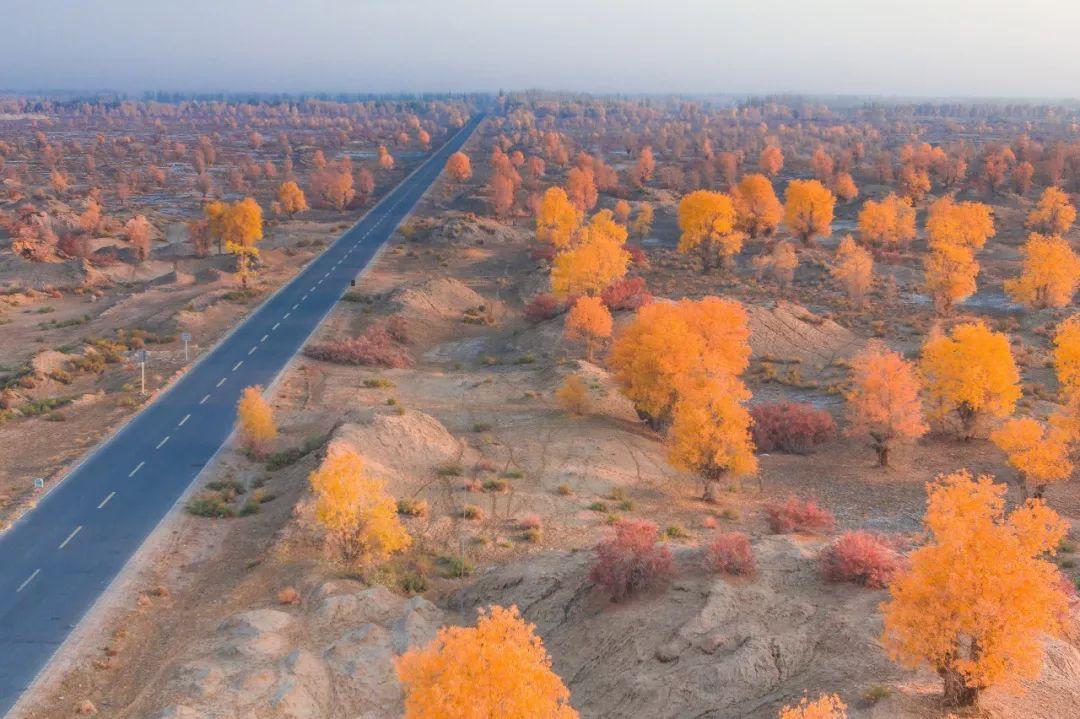金秋十月过去,你会在这条荒凉的沙漠公路上遇到沙漠胡杨,美不胜收。