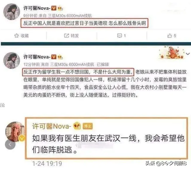 许可馨家庭条件优渥,个性张扬,在这次事发前就已经发表过很多次不当言论,只是事儿不够大,没在江湖溅起什么水花。