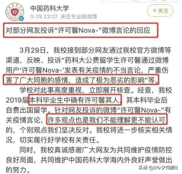 3月29号早上,许可馨的母校中国药科大学出来发表声明,确认许是本校学生,其他则只字不提,明哲保身。紧随其后,29号的下午,许可馨终于出来发表道歉书,“表示认识到自己错误”!