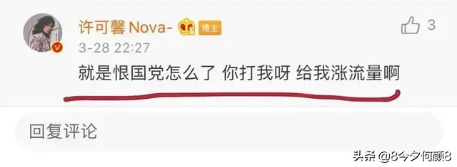 一开始时,许可馨还没有预料到事情的严重性,反倒觉得是个成名的机会。于是在第二天,也就是28号晚,许可馨继续狂傲,公然叫阵:“你打我呀,给我涨流量啊”