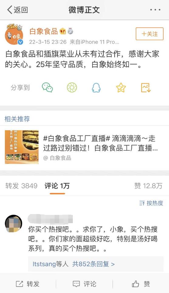 冬残奥会期间,白象因为员工有三分之一是残障人士,被网友送上了热搜。315土坑酸菜问题曝光后,白象的霸气回应再次赢得大批网友点赞。有网友哭谏白象去买个热榜,结果是白象没有花钱,但热榜有了。