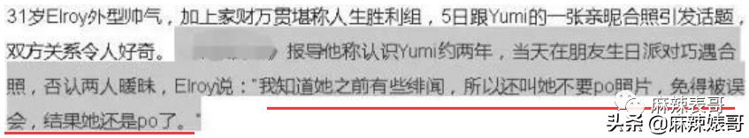 后来记者跑去问Elroy,Elroy说:“知道她之前有些绯闻,所以叫她不要晒照片免得被误会,结果还是晒了。”