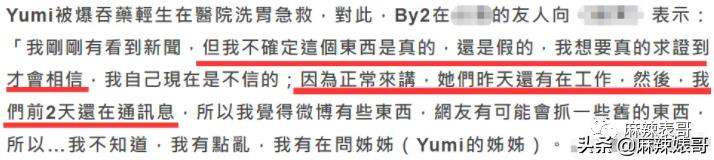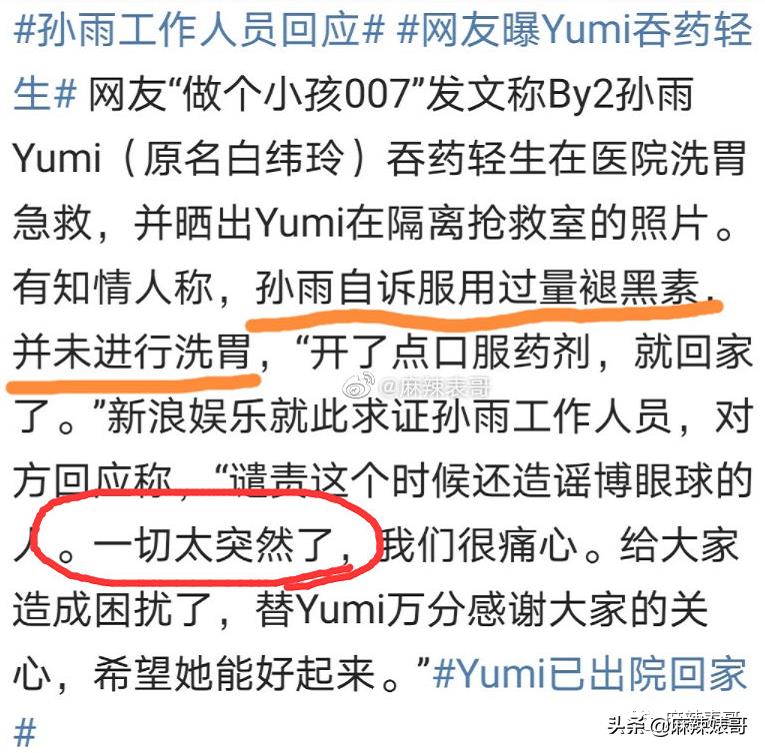湾湾那边媒体采访到Yumi的朋友,说前两天还在和Yumi联系,昨天还在工作,朋友不太信她会自杀。