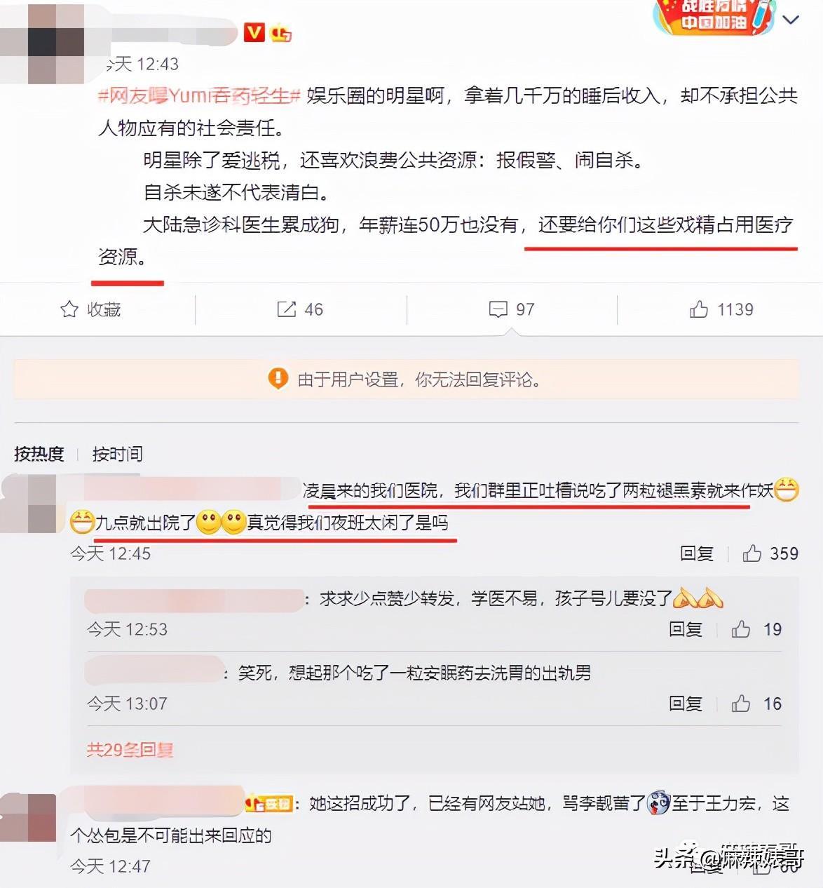 今天早上9点多,一个叫“做个小孩007”的网友@王力宏,说Yumi吞药轻生,在医院洗胃急救,如果出事,饶不了王力宏。