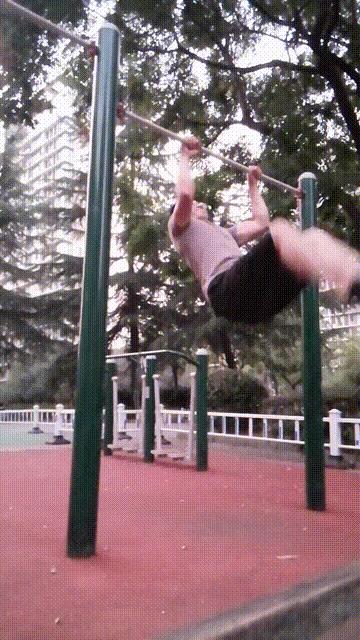 再看下面这张动图,先拉半个引体,注意这个引体不要拉满,头顶过单杠即可,拉完引体以后,用腰腹发力,把腿往上抬起,这样更容易把你的身体重心拉高,当你的大腿面可以靠在单杠上面的时候,这时候就成功一半了。