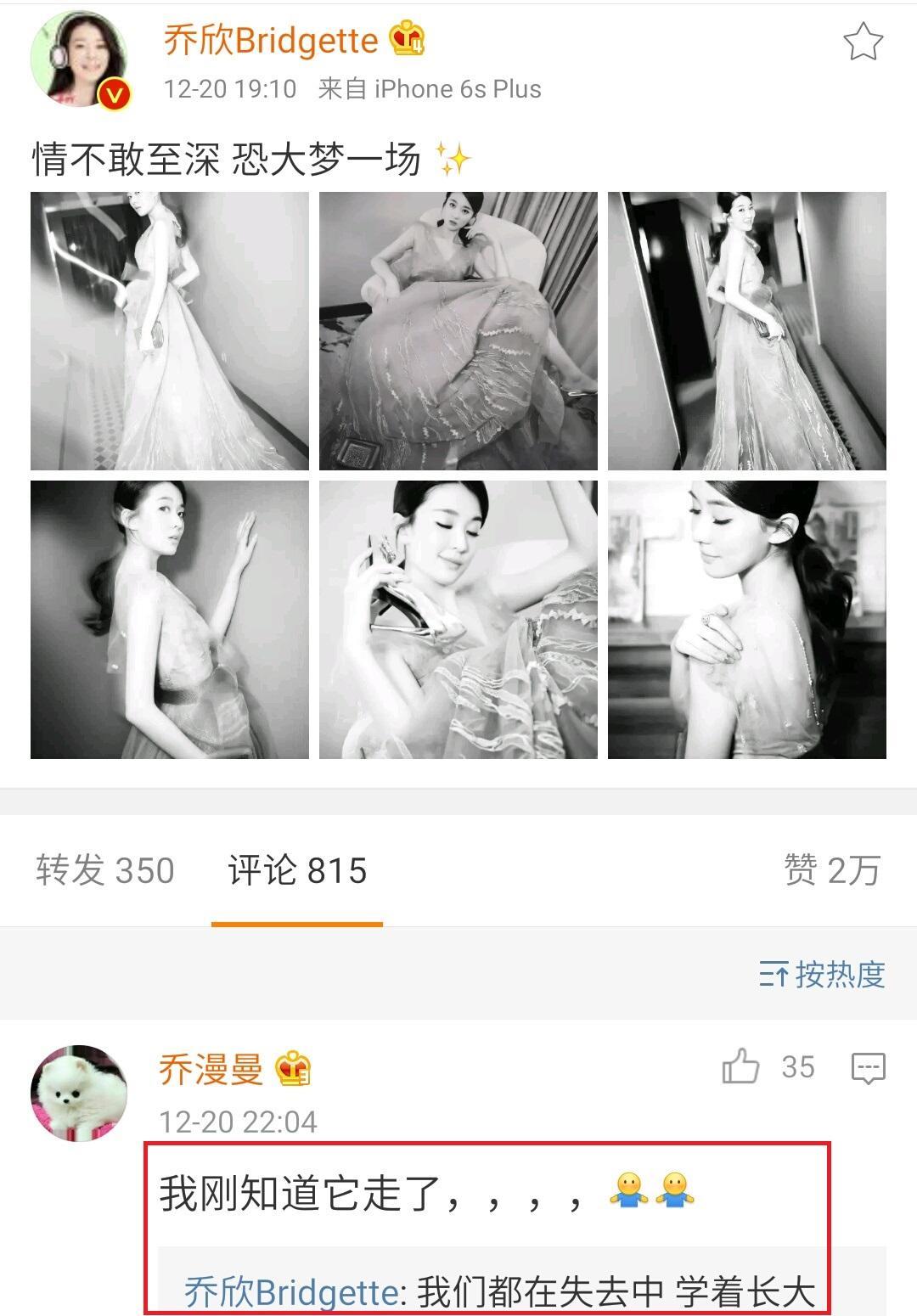 两个人都养了一条猫,名字叫赫本,12月20号凌晨四点的时候去世了,乔欣发了一条微博:“情不敢至深,恐大梦一场。”下面也有朋友安慰她