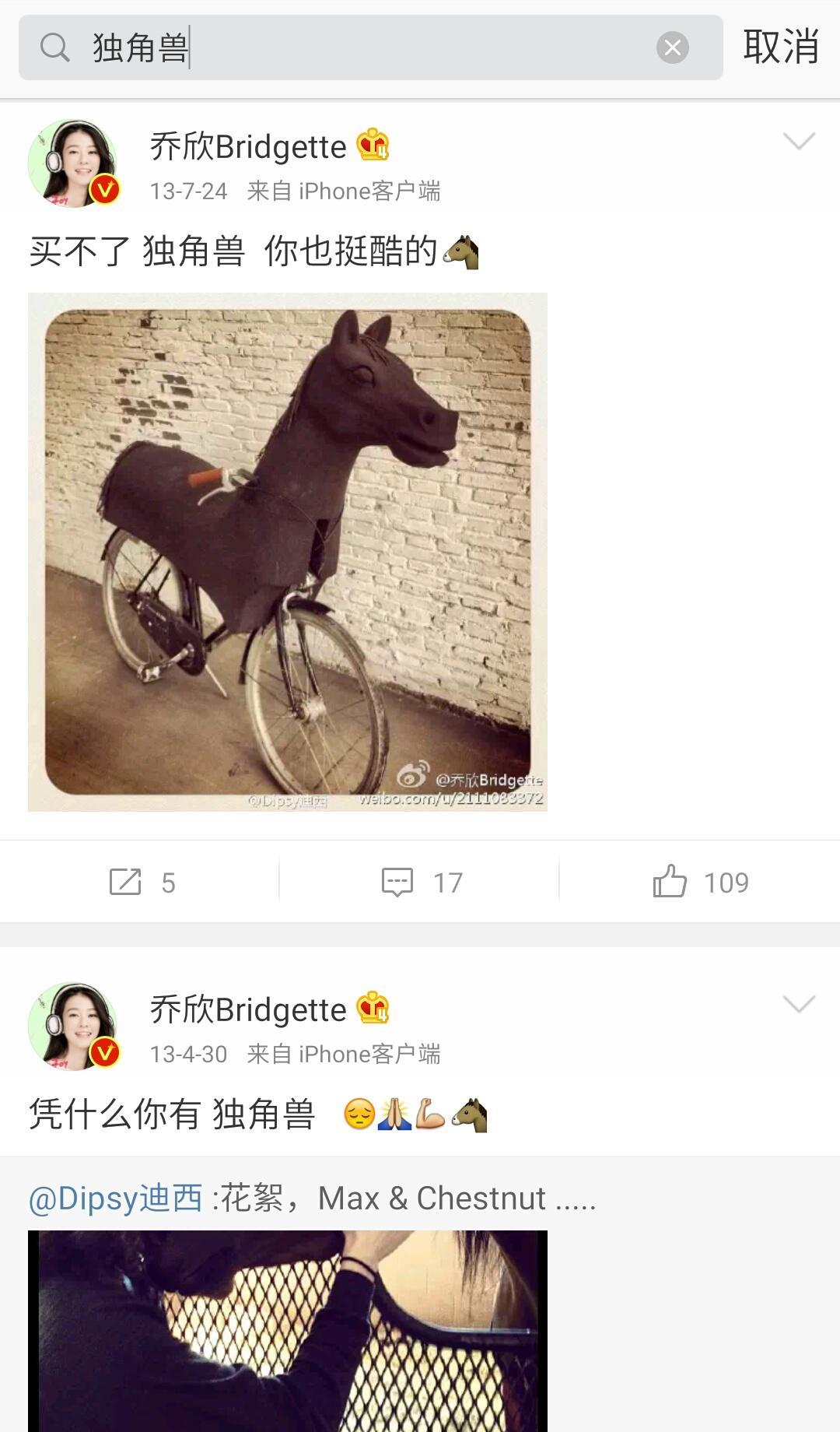 乔欣的粉丝都知道,乔欣一直都很喜欢独角兽,微博有好几条关于独角兽的微博,很早以前就就抱怨过自己为什么没有独角兽……
