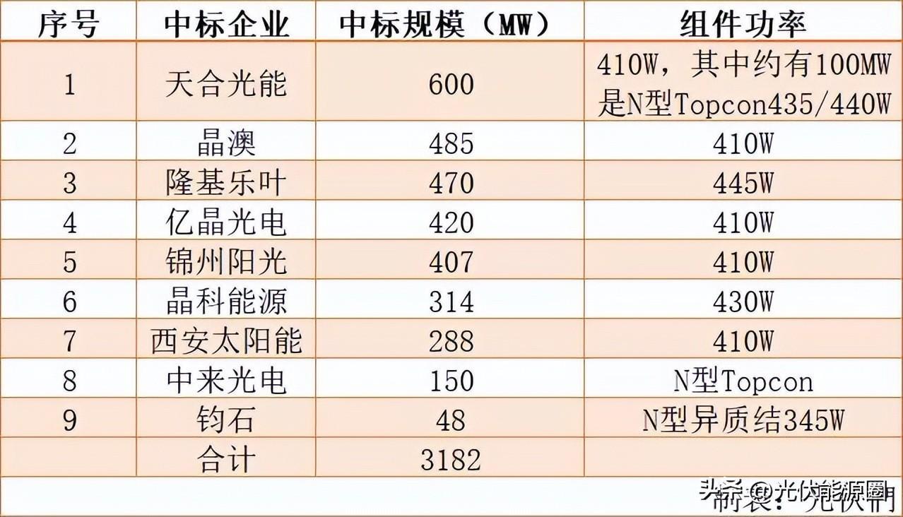光伏电站采用"组件:逆变器=1.3:1"的超配,因此组件总规模为3.1GW。各家组件的份额如下表,最终的订单规模仍将根据项目具体情况进行微调。