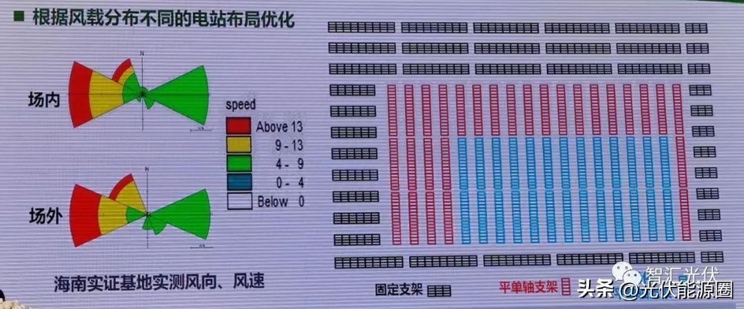 根据之前实证基地的数据,光伏电站建成后,场区内风速、风向会发生明显变化,13m/s以上的极大风速将明显降低。根据风载分布的不同,对光伏电站的发电单元进行了优化设计。
