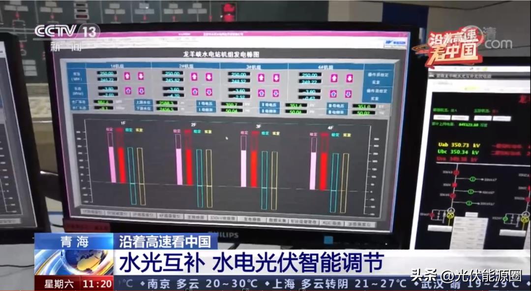 距离青海共和太阳能发电园40多公里外就是龙羊峡水电站,水电站中控室内电脑清晰显示着水电站和光伏电站的即时发电情况,并通过电脑智能调节实现电能的水光互补。