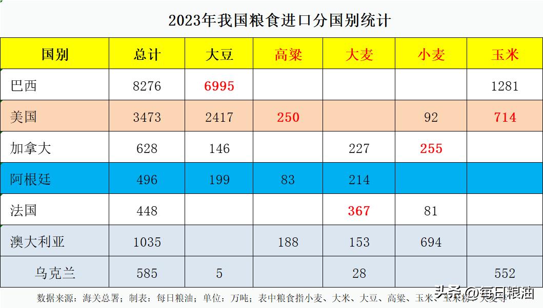 从各品种的进口来源来看,我国第一大大豆和玉米进口来源国均为巴西,分别进口总量达到6995万吨和1281万吨;高粱第一进口来源国则为美国,大麦进口第一来源国为法国,小麦第一进口来源国则为澳大利亚。