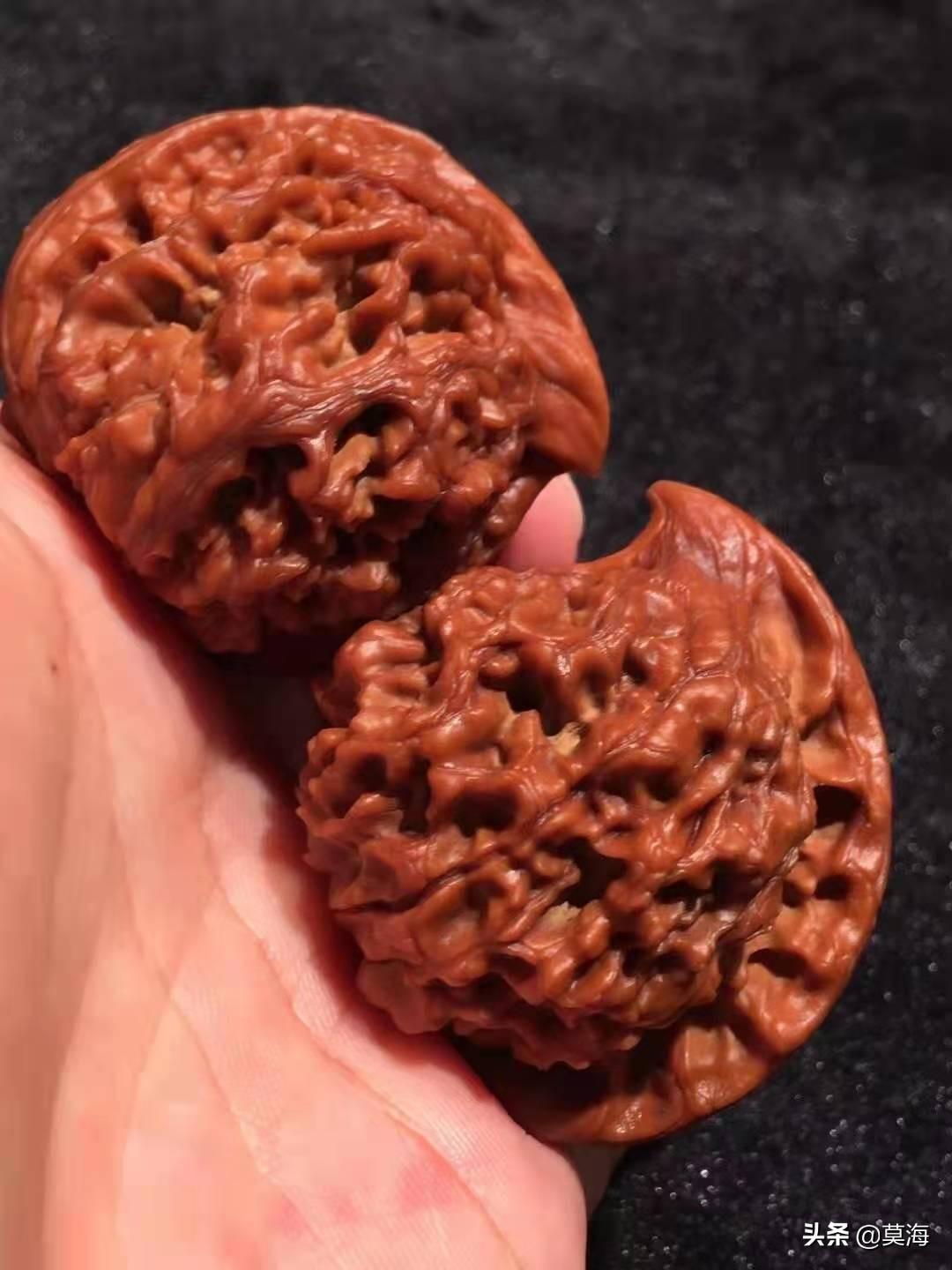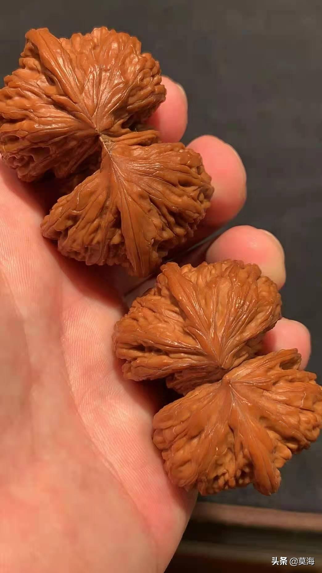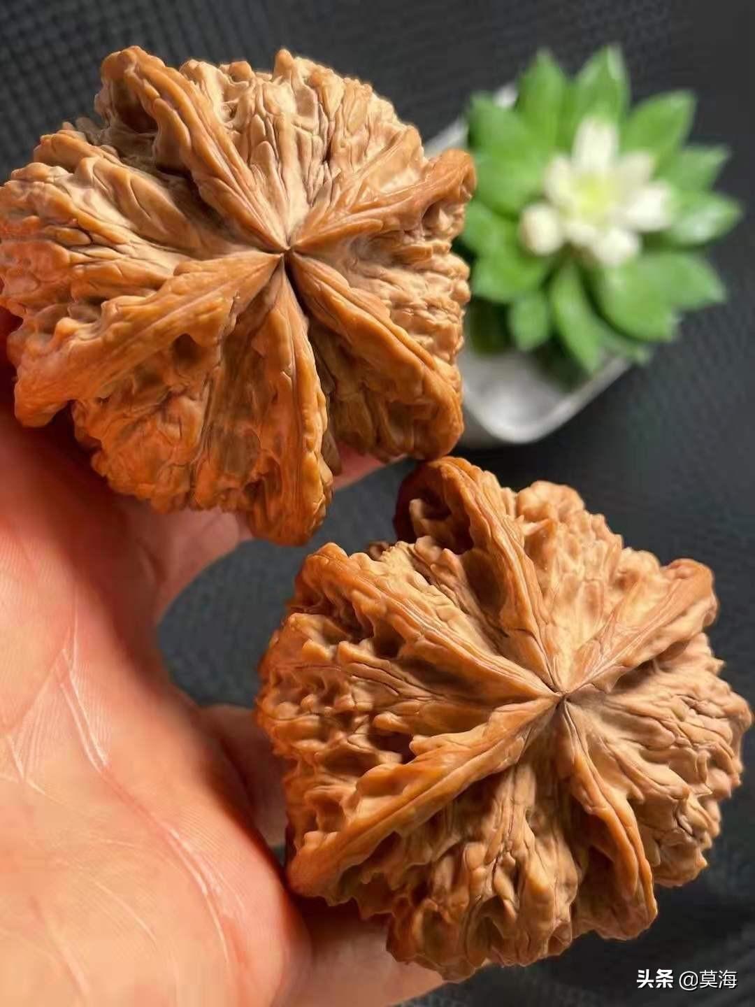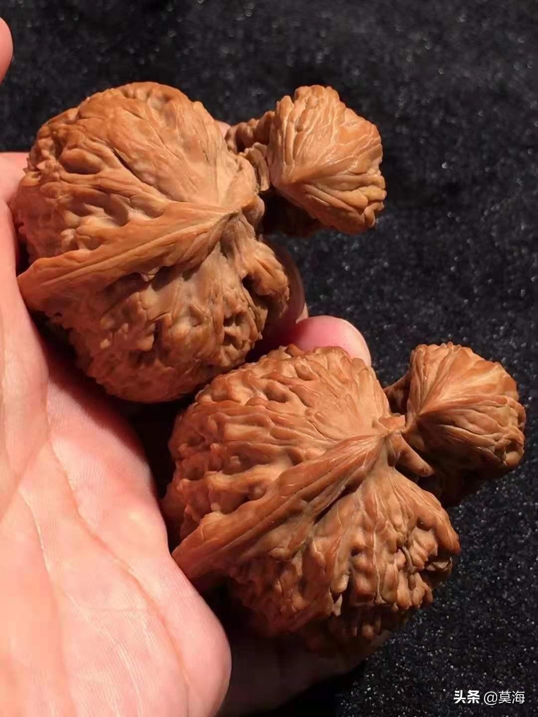 不过,真的有天价几十万的文玩核桃吗?去掉那些有历史,有传承的包浆老核桃不说,新下树的一对小小掌上玩物,动辄几千,几万甚至十几万,到底是炒作还是物有所值呢?有句话叫物以稀为贵,在这个人为干预越来越普遍的文玩核桃市场,嫁接,打药,上夹板,导致野生的核桃青皮越来越少,嫁接打药出来的核桃虽然形状越来越好看,尺寸越来越大,可皮质密度却大不如从前,一颗老树或是野生核桃树出不了几个能配上对的原生果,这就导致了原生,野生大尺寸文玩核桃价格奇货可居,高的离谱,可也不是炒作和虚高,文玩核桃确实有一块高端的市场,资深玩家宁愿花高价抓一对没有人工干预,自然生长,高密度大尺寸配对好的名贵品种,说是拿在手里,看在眼里,心里得劲,文玩核桃玩的就是这份惬意。还有就是一些异性核桃,比如三棱,四棱甚至五星上将,连体,鹰嘴,半壁江山等等品种,价格一直居高不下,也是因为产量极低,配对太难。比如一对白狮子的五棱核桃,好几百颗树上的青皮,或许能开出一只五棱的核桃,那么这只核桃的价格就已经很高了,需要经过几个月甚至几年的时间,从器型,大小,骨质,皮质上去找另外一只五棱的核桃,给它配上对,也就是文玩核桃的娶妻。这样的一对异性的核桃无论从人力,财力,时间上来看,价格只能很高,甚至能配上对的那一只核桃开价几万也比比皆是,所以这样的一对核桃卖价几万,十几万也就不足为奇了。