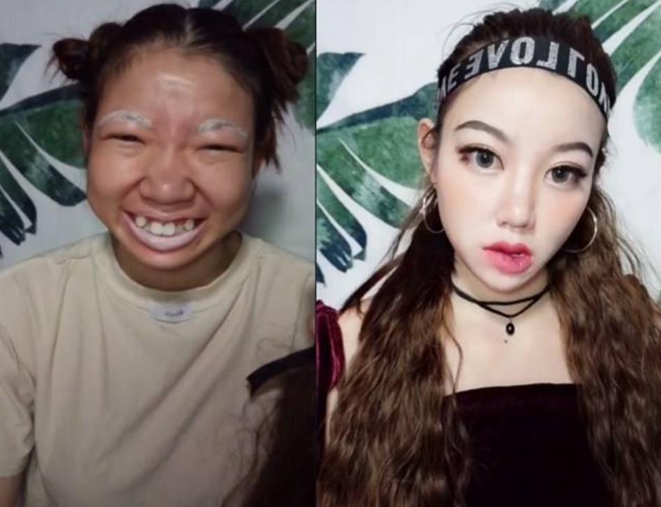 首先,你要有一个美颜手机,打开美颜满级、磨皮满级、滤镜满级、瘦脸满级和大眼满级,然后你就会发现,原来自己可以长得这么好看。这时再辅佐以化妆术,戴上假发,贴上瘦腮帮的绷带,再涂上眼影,贴上双眼皮和大睫毛,你的女性蛇精脸就被勾勒出来了。